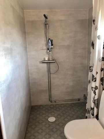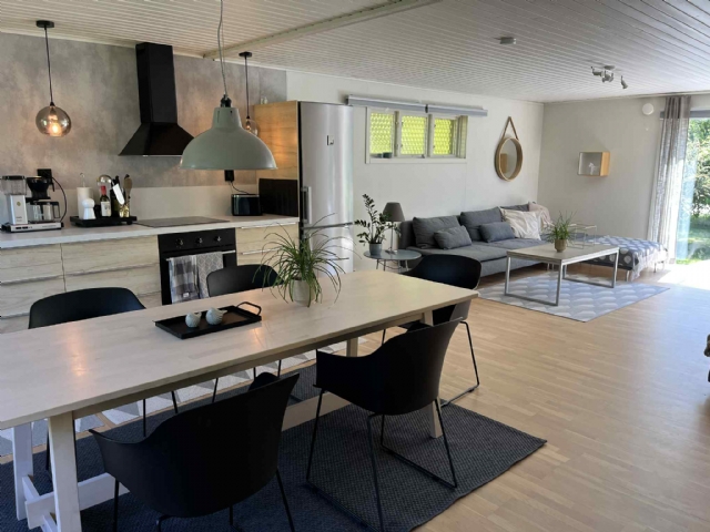 Här finns två allrum, varav det ena har stor mysig soffa och två fåtöljer mot braskaminen. Det andra allrummet är med fullt utrustat kök, med en öppen planlösning. Här finns stort matbord/stolar och dessutom sällskapsyta med soffa och fåtölj. Fräsch toalett med dusch och tvättstuga med tvättmaskin och torktumlare.