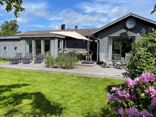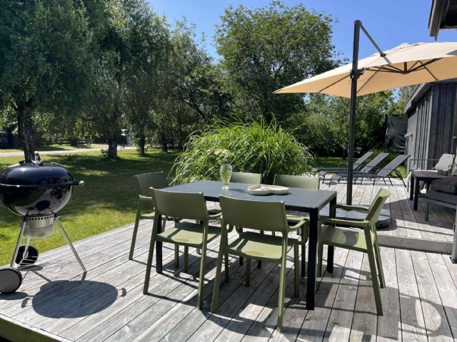 Den 800 kvm stora trädgården har gräsmatta med lummig inramning. Här hittar du en stor, härlig studsmatta och gunga. På det stora trädäcket finns utemöbler, solsängar och grill för sköna sommarkvällar.