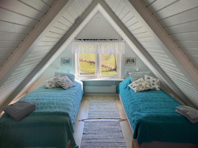 Övre plan är ett öppet sovloft med 4 sängar och stort panoramafönster, ingång från mellanplan eller utvändig trappa. Innertrappan är brant, men yttertrappan har normal lutning och breda trappsteg. Källarplanet har helkaklat duschrum/tvättstuga, toalett och förråd.